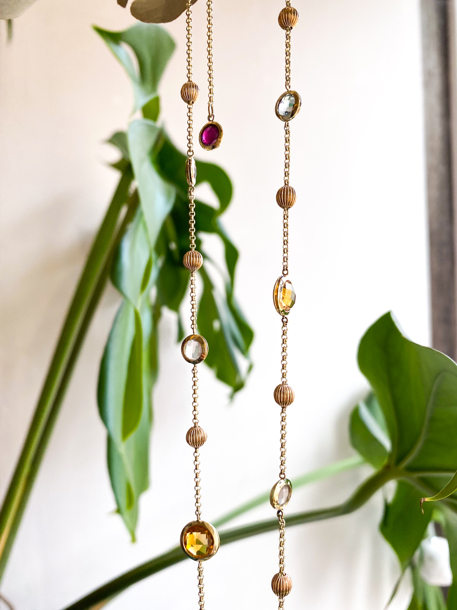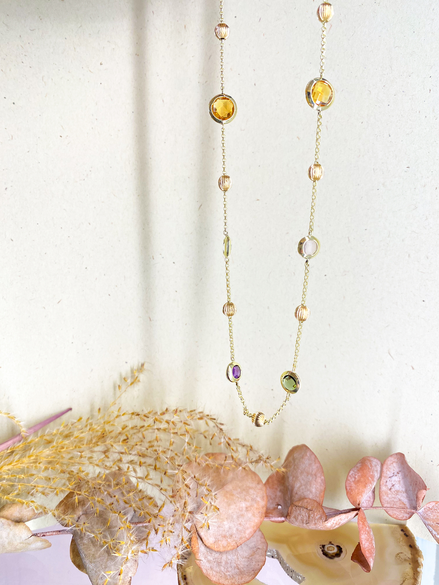 Elegantní, něžný a dámsky půvabný. Náhrdelník ze žlutého zlata ztělesňuje dokonalou ženskost. Tu podtrhují přírodní minerály a zlaté dekorativní kuličky. Přírodní kameny s geometrickým leštěním jsou jemně oválné či kulaté svým tvarem. Povrch čoček zdobí jemné plošky. Přírodní minerály jsou v náhrdelníku zastoupeny topazem modrým, růženínem, vltavínem, citrínem a ametystem. Kombinace zlata a drahých kamenů je naprosto nadčasová, ideální k různě barevným outfitům.