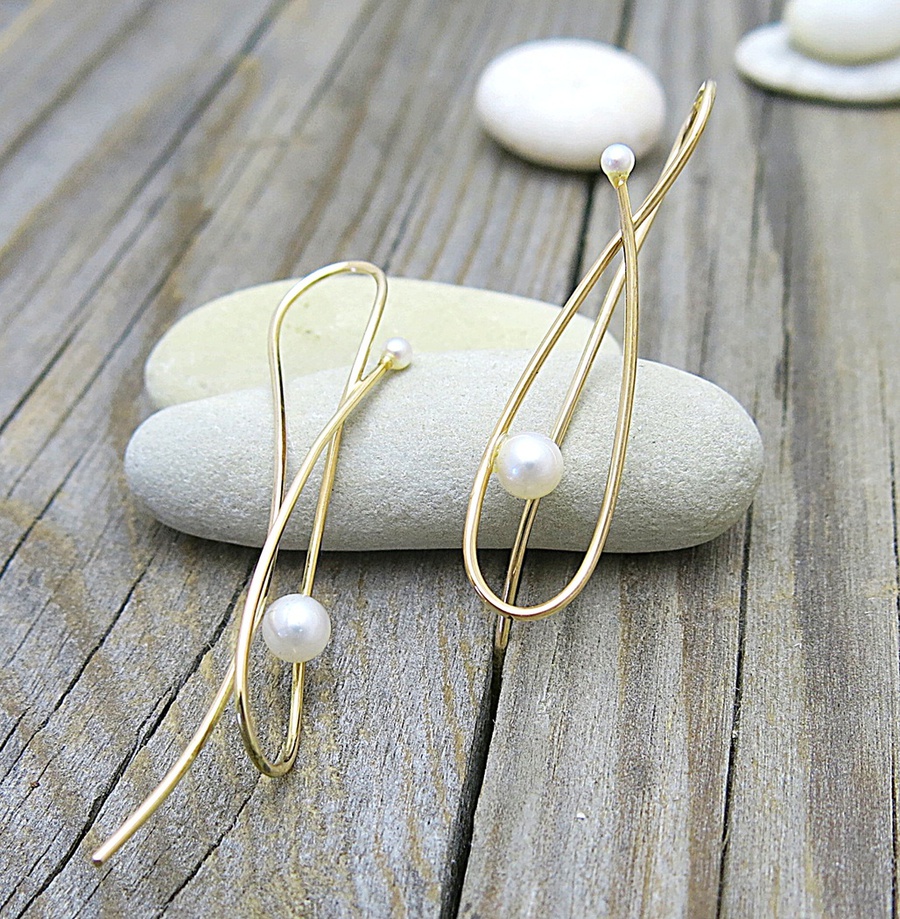 Provlékací náušnice z růžového zlata jsou luxusně dlouhé a designově neotřelé. Zlaté náušnice jsou výrazné, jejich romantický i elegantní vzhled je kombinací jednoduchého, leč netypického, tvaru a zlatého vzoru s lesklou perlou.