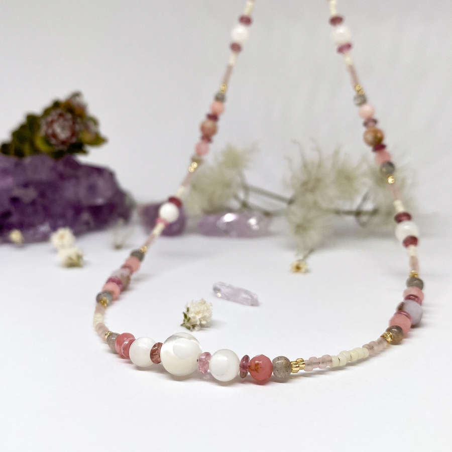 Použité minerály: perleť, turmalín růžový - rubelit, opál růžový, labradorit