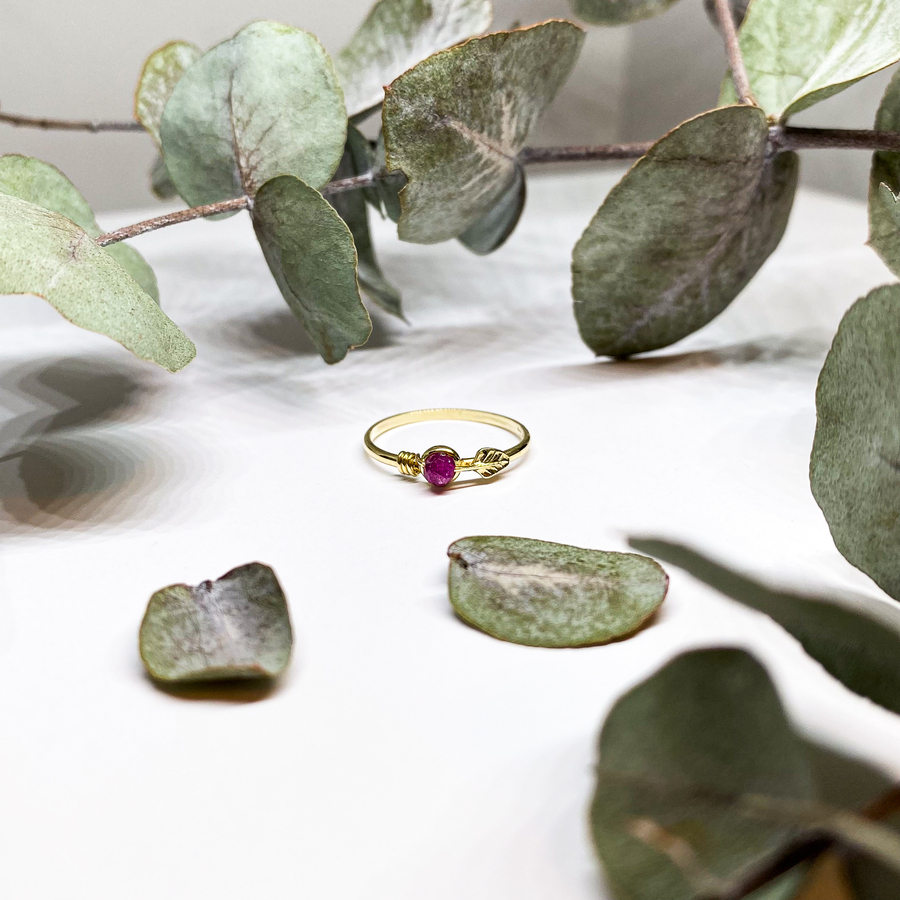 Prsten ze žlutého zlata s rubínem je jemným prstýnkem, kterému na něžnosti přidává růžový rubín. Jemnost, něžnost a eleganci prstýnku vyznačuje drobný lístek ze žlutého zlata. Rubín dodává svému nositeli energii stát si za svým a je kamenem hojnosti a nadšení.