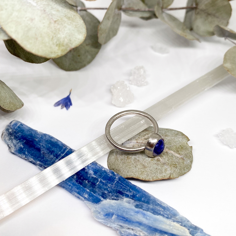 Jednoduchý stříbrný prsten s dominantním minerálem sodalitem s hlubokými modrými tóny připomínajícími noční oblohu. Sodalit je známý jako kámen intuice, klidu a sebepoznání, což vnese svému nositeli pozitivní energii a klid i do hektického dne. Prsten je ošetřen matováním a rhodiováním pro zachování odolnosti a barvy.