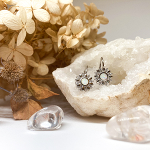 Stříbrné náušnice ve tvaru květin s modrým syntetickým opálem, který na slunečním svitu hraje všemi barvami a zirkony.