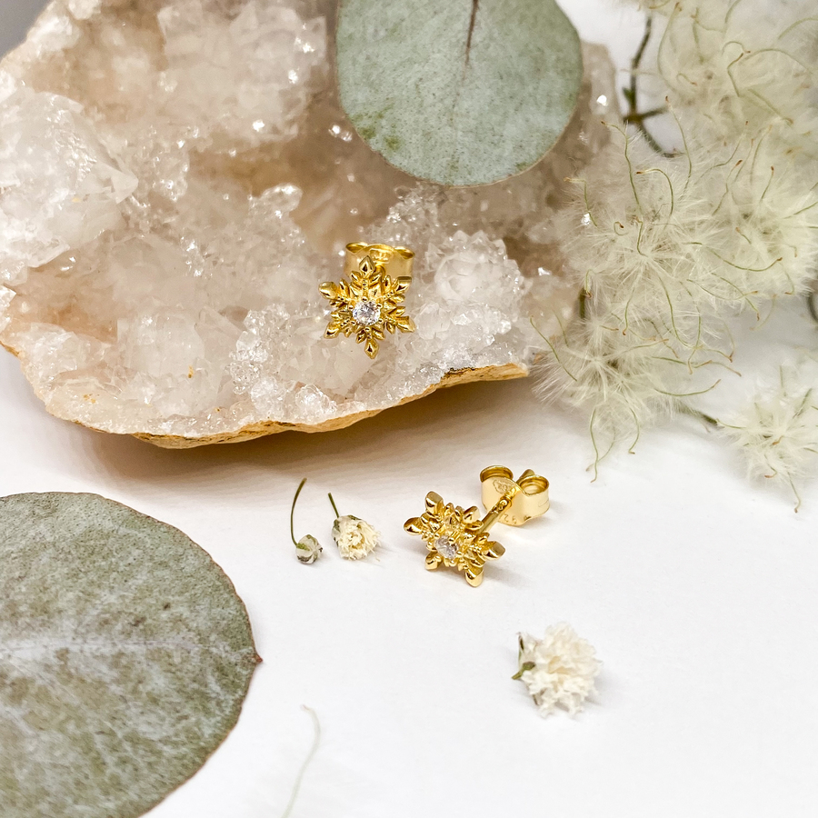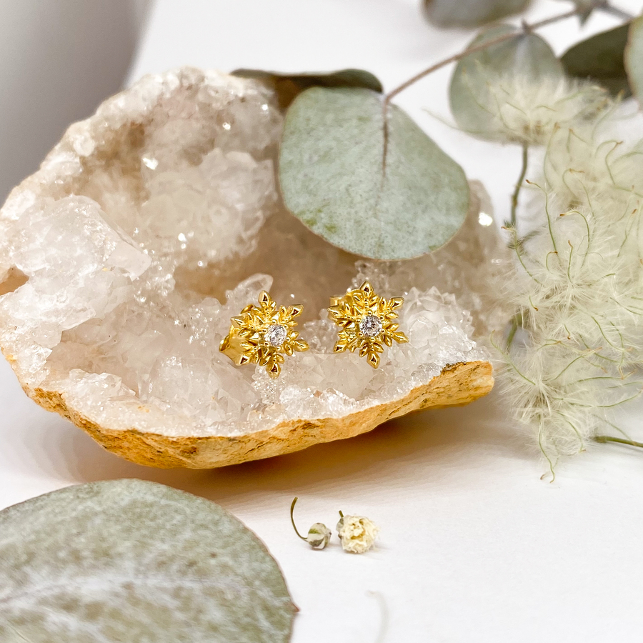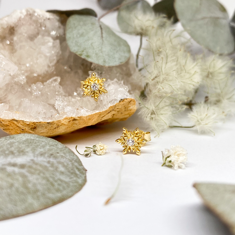 Stříbrné náušnice - sněhové vločky se zirkonem (zlatě rhodiované)