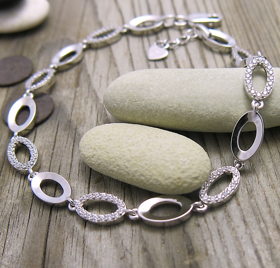 Náramek ze stříbra se zirkony je tvořen jemnými oválky. Polovina oválných stříbrných článků je s vysokým leskem a druhá polovina oválků je posázena zářivýmy zirkony – oválné články se zirkony a bez se pravidelně střídají a dokonale spolu ladí.