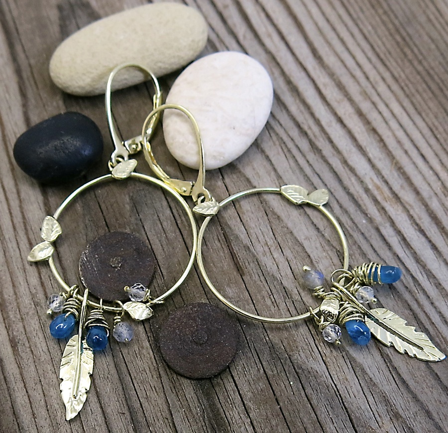 Lapače snů – romantické, výrazné a jedinečné visací zlaté náušnice jsou zdobeny jemnými lístečky a doplněny minerály, jako je apatit, křišťál a měsíční kámen.