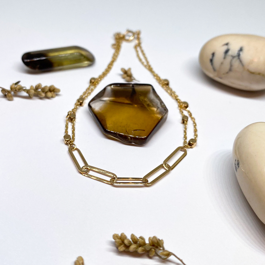 Náramek z naší ruční dílny spojuje jemnost zlatých oválných oček s třpytem broušených kostiček, které odrážejí světlo ze všech úhlů. Výsledkem je unikátní šperk, který přitáhne pozornost svou hravostí a zároveň působí decentně. Skvěle doplní jakýkoli outfit a přinese vašemu stylu nenápadný, přesto luxusní nádech.