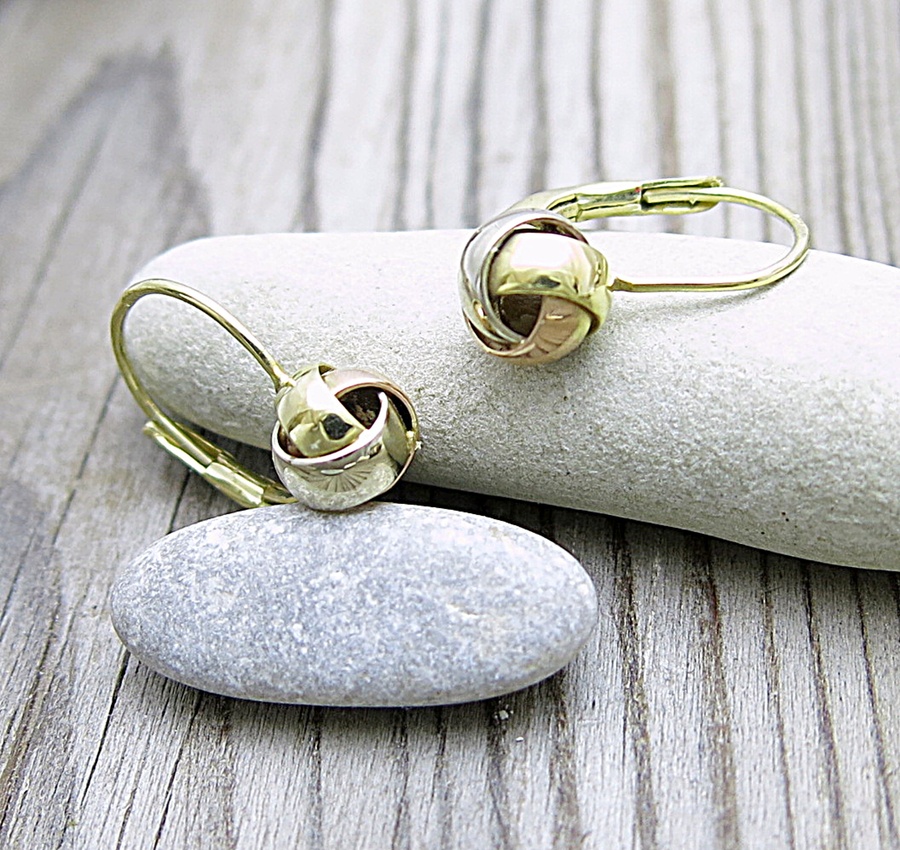 Náušnice ze žlutého zlata v klasickém motivu zauzleného součku jsou vyrobené ze tří druhů zlata – žlutého, bílého a růžového. Náušnice z tříbarevného zlata jsou ruční výroby.