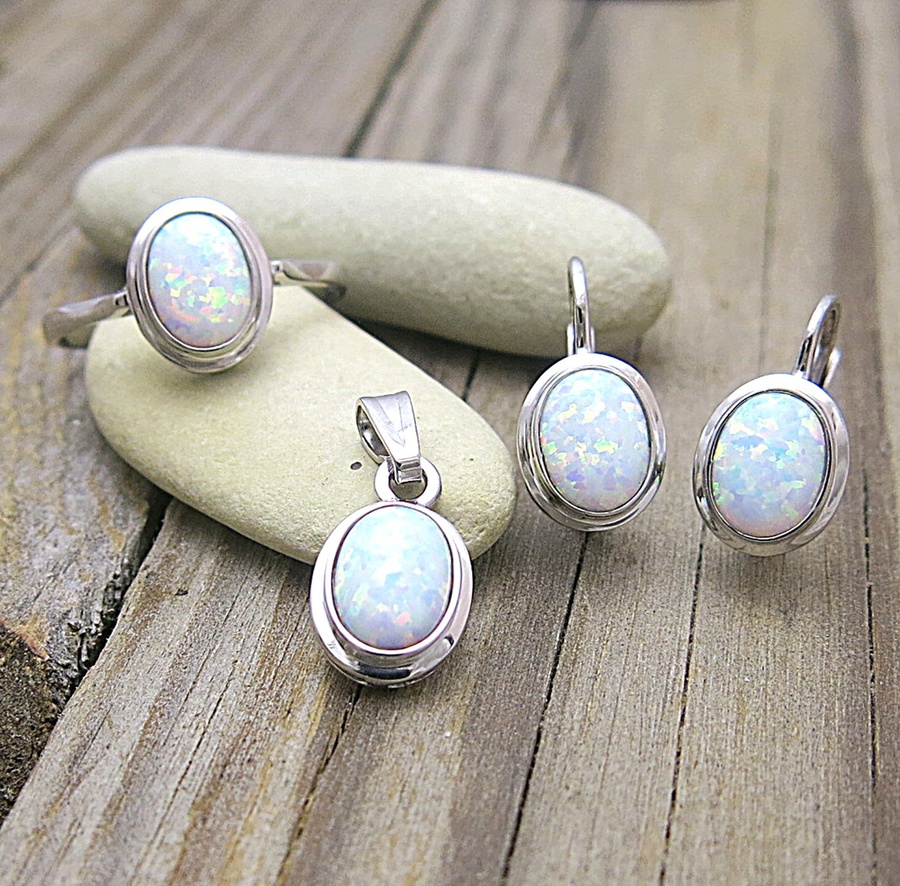 Krásnou a velmi elegantní soupravu šperků z bílého zlata s opály tvoří zlaté náušnice, prsten a přívěsek. Šperky jsou slušivé a výrazné, lesklé plochy bílého zlata jemně doladí krásné barvy opálu.