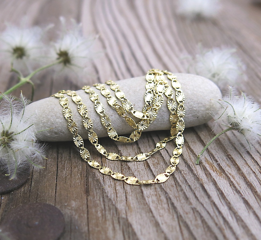 Zlatý náhrdelník s velmi jemným reliéfem vypadá velmi něžně a romanticky na dekoltu.