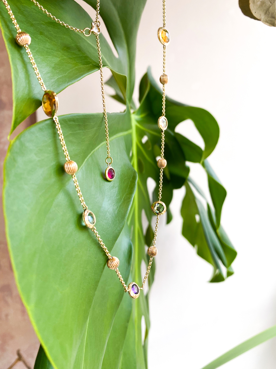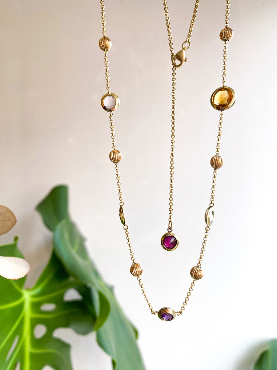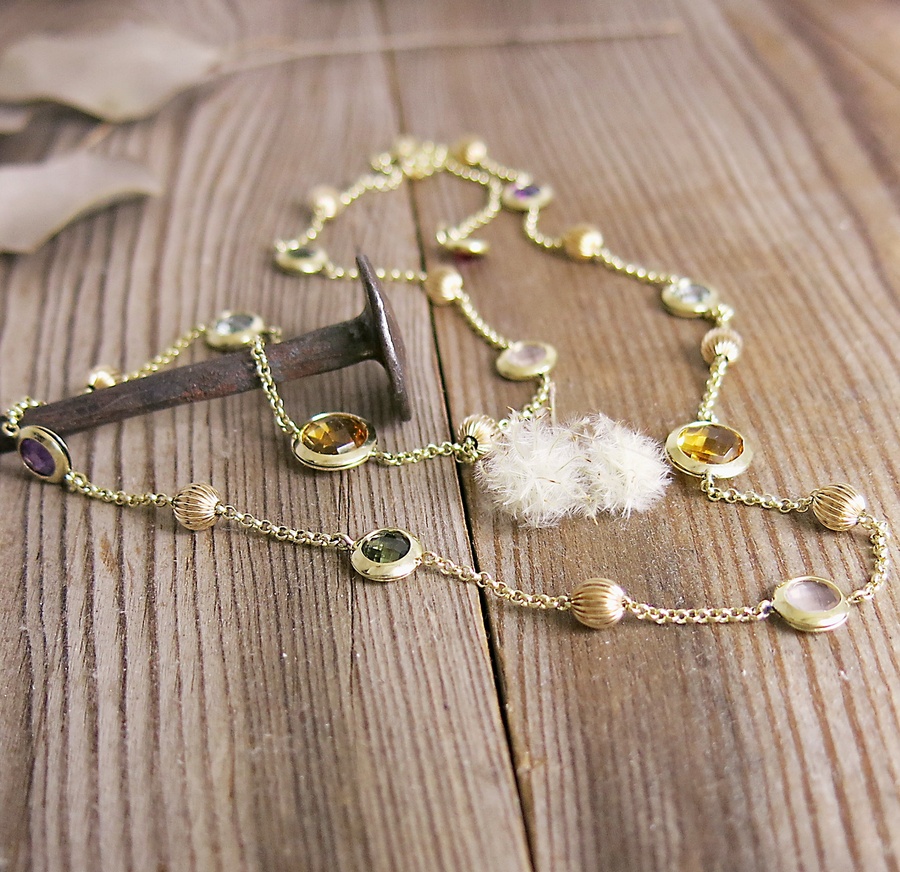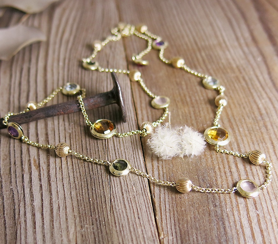 Náhrdelník ze žlutého zlata s přírodními leštěnými minerály