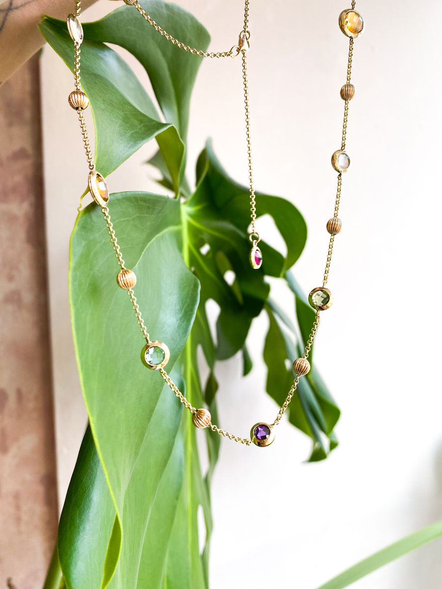 Elegantní, něžný a dámsky půvabný. Náhrdelník ze žlutého zlata ztělesňuje dokonalou ženskost. Tu podtrhují přírodní minerály a zlaté dekorativní kuličky. Přírodní kameny s geometrickým leštěním jsou jemně oválné či kulaté svým tvarem. Povrch čoček zdobí jemné plošky. Přírodní minerály jsou v náhrdelníku zastoupeny topazem modrým, růženínem, vltavínem, citrínem a ametystem. Kombinace zlata a drahých kamenů je naprosto nadčasová, ideální k různě barevným outfitům.