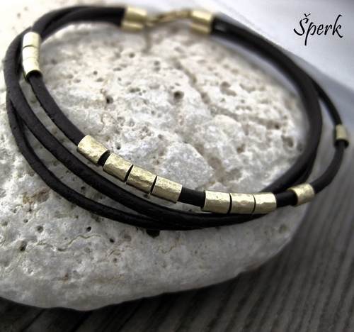 Náramky typu unisex se hodí pro muže i pro ženy. Tento nadčasový kožený náramek s 12 zlatými články je velmi vděčným dárkem. Kombinace kůže a zlata je osvědčená klasika, která vypadá dobře jak na silném mužském zápěstí, tak na jemné ženské ruce. Vyrábíme ho na zakázku, můžeme vám nastavit délku podle vašeho přání.