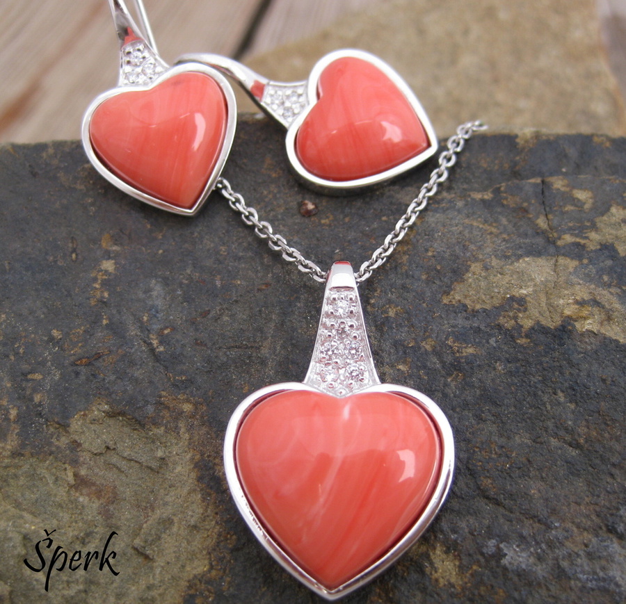 Stříbrná souprava šperků růžový korál – romantický přívěsek na 42cm řetízku a náušnice s růžovými srdíčky, v nichž získáte půvabný a nadčasový šperk.
